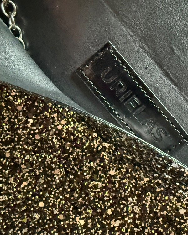 Está realizado en glitter negro y plata, con un aplique de rayo que refleja la esencia Urielas: actitud, estilo y un toque de atrevimiento.